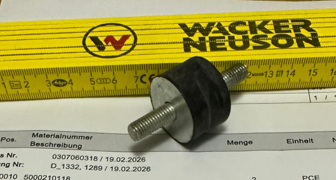 Антивибрационный демпфер (shockmount, gummi-metall-puffer) 50x20, оригинальная запчасть Wacker Neuson, предназначен для реверсивных виброплит серии DPU, в том числе DPU130 / DPU130Le. Используется для гашения вибраций и снижения ударных нагрузок в узлах крепления верхней массы и рамы.